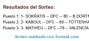 Lista de participantes: 1- SOKRATIS -- DFC -- 80 -- B.DORTMUND, 2- KABOUL -- DFC -- 80 -- TOTTENHAM, 3- MATHIEU -- DFC --78 -- VALENCIA.
