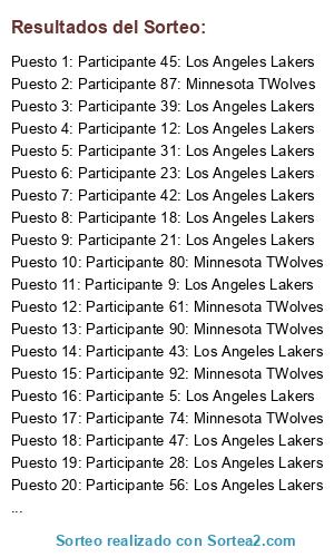 Lista de participantes: Participante 1: Los Angeles Lakers, Participante 2: Los Angeles Lakers, Participante 3: Los Angeles Lakers, Participante 4: Los Angeles Lakers, Participante 5: Los Angeles Lakers, Participante 6: Los Angeles Lakers, Participante 7: Los Angeles Lakers, Participante 8: Los Angeles Lakers, Participante 9: Los Angeles Lakers, Participante 10: Los Angeles Lakers, Participante 11: Los Angeles Lakers, Participante 12: Los Angeles Lakers, Participante 13: Los Angeles Lakers, Participante 14: Los Angeles Lakers, Participante 15: Los Angeles Lakers, Participante 16: Los Angeles Lakers, Participante 17: Los Angeles Lakers, Participante 18: Los Angeles Lakers, Participante 19: Los Angeles Lakers, Participante 20: Los Angeles Lakers, Participante 21: Los Angeles Lakers, Participante 22: Los Angeles Lakers, Participante 23: Los Angeles Lakers, Participante 24: Los Angeles Lakers, Participante 25: Los Angeles Lakers, Participante 26: Los Angeles Lakers, Participante 27: Los Angeles Lakers, Participante 28: Los Angeles Lakers, Participante 29: Los Angeles Lakers, Participante 30: Los Angeles Lakers, Participante 31: Los Angeles Lakers, Participante 32: Los Angeles Lakers, Participante 33: Los Angeles Lakers, Participante 34: Los Angeles Lakers, Participante 35: Los Angeles Lakers, Participante 36: Los Angeles Lakers, Participante 37: Los Angeles Lakers, Participante 38: Los Angeles Lakers, Participante 39: Los Angeles Lakers, Participante 40: Los Angeles Lakers, Participante 41: Los Angeles Lakers, Participante 42: Los Angeles Lakers, Participante 43: Los Angeles Lakers, Participante 44: Los Angeles Lakers, Participante 45: Los Angeles Lakers, Participante 46: Los Angeles Lakers, Participante 47: Los Angeles Lakers, Participante 48: Los Angeles Lakers, Participante 49: Los Angeles Lakers, Participante 50: Los Angeles Lakers, Participante 51: Los Angeles Lakers, Participante 52: Los Angeles Lakers, Participante 53: Los Angeles Lakers, Participante 54: Los Angeles Lakers, Participante 55: Los Angeles Lakers, Participante 56: Los Angeles Lakers, Participante 57: Minnesota TWolves, Participante 58: Minnesota TWolves, Participante 59: Minnesota TWolves, Participante 60: Minnesota TWolves, Participante 61: Minnesota TWolves, Participante 62: Minnesota TWolves, Participante 63: Minnesota TWolves, Participante 64: Minnesota TWolves, Participante 65: Minnesota TWolves, Participante 66: Minnesota TWolves, Participante 67: Minnesota TWolves, Participante 68: Minnesota TWolves, Participante 69: Minnesota TWolves, Participante 70: Minnesota TWolves, Participante 71: Minnesota TWolves, Participante 72: Minnesota TWolves, Participante 73: Minnesota TWolves, Participante 74: Minnesota TWolves, Participante 75: Minnesota TWolves, Participante 76: Minnesota TWolves, Participante 77: Minnesota TWolves, Participante 78: Minnesota TWolves, Participante 79: Minnesota TWolves, Participante 80: Minnesota TWolves, Participante 81: Minnesota TWolves, Participante 82: Minnesota TWolves, Participante 83: Minnesota TWolves, Participante 84: Minnesota TWolves, Participante 85: Minnesota TWolves, Participante 86: Minnesota TWolves, Participante 87: Minnesota TWolves, Participante 88: Minnesota TWolves, Participante 89: Minnesota TWolves, Participante 90: Minnesota TWolves, Participante 91: Minnesota TWolves, Participante 92: Minnesota TWolves, Participante 93: Minnesota TWolves, Participante 94: Minnesota TWolves, Participante 95: Minnesota TWolves, Participante 96: Minnesota TWolves, Participante 97: Minnesota TWolves, Participante 98: Minnesota TWolves, Participante 99: Minnesota TWolves, Participante 100: Minnesota TWolves.