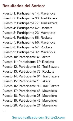 Lista de participantes: Participante 1: Lakers, Participante 2: Lakers, Participante 3: Lakers, Participante 4: Lakers, Participante 5: Lakers, Participante 6: Lakers, Participante 7: Lakers, Participante 8: Lakers, Participante 9: Lakers, Participante 10: Lakers, Participante 11: Lakers, Participante 12: Lakers, Participante 13: Lakers, Participante 14: Mavericks, Participante 15: Mavericks, Participante 16: Mavericks, Participante 17: Mavericks, Participante 18: Mavericks, Participante 19: Mavericks, Participante 20: Mavericks, Participante 21: Mavericks, Participante 22: Mavericks, Participante 23: Mavericks, Participante 24: Mavericks, Participante 25: Mavericks, Participante 26: Mavericks, Participante 27: Mavericks, Participante 28: Mavericks, Participante 29: Mavericks, Participante 30: Mavericks, Participante 31: Mavericks, Participante 32: Mavericks, Participante 33: Mavericks, Participante 34: Mavericks, Participante 35: Mavericks, Participante 36: Mavericks, Participante 37: Mavericks, Participante 38: Mavericks, Participante 39: Mavericks, Participante 40: Mavericks, Participante 41: Mavericks, Participante 42: Mavericks, Participante 43: Mavericks, Participante 44: Mavericks, Participante 45: Mavericks, Participante 46: Mavericks, Participante 47: Mavericks, Participante 48: Mavericks, Participante 49: Mavericks, Participante 50: Mavericks, Participante 51: Mavericks, Participante 52: Mavericks, Participante 53: Mavericks, Participante 54: Mavericks, Participante 55: Mavericks, Participante 56: Rockets, Participante 57: Rockets, Participante 58: Rockets, Participante 59: Rockets, Participante 60: Rockets, Participante 61: Rockets, Participante 62: Rockets, Participante 63: Rockets, Participante 64: Rockets, Participante 65: Rockets, Participante 66: Rockets, Participante 67: Rockets, Participante 68: Rockets, Participante 69: Rockets, Participante 70: Rockets, Participante 71: Rockets, Participante 72: Rockets, Participante 73: Rockets, Participante 74: Rockets, Participante 75: Rockets, Participante 76: Rockets, Participante 77: TrailBlazers, Participante 78: TrailBlazers, Participante 79: TrailBlazers, Participante 80: TrailBlazers, Participante 81: TrailBlazers, Participante 82: TrailBlazers, Participante 83: TrailBlazers, Participante 84: TrailBlazers, Participante 85: TrailBlazers, Participante 86: TrailBlazers, Participante 87: TrailBlazers, Participante 88: TrailBlazers, Participante 89: TrailBlazers, Participante 90: TrailBlazers, Participante 91: TrailBlazers, Participante 92: TrailBlazers, Participante 93: TrailBlazers, Participante 94: TrailBlazers, Participante 95: TrailBlazers, Participante 96: TrailBlazers, Participante 97: TrailBlazers, Participante 98: TrailBlazers, Participante 99: TrailBlazers, Participante 100: TrailBlazers, Participante 101: TrailBlazers, Participante 102: TrailBlazers, Participante 103: TrailBlazers, Participante 104: TrailBlazers, Participante 105: TrailBlazers, Participante 106: TrailBlazers, Participante 107: TrailBlazers, Participante 108: TrailBlazers, Participante 109: TrailBlazers, Participante 110: TrailBlazers, Participante 111: TrailBlazers, Participante 112: TrailBlazers, Participante 113: TrailBlazers, Participante 114: TrailBlazers, Participante 115: TrailBlazers, Participante 116: TrailBlazers, Participante 117: TrailBlazers, Participante 118: TrailBlazers, Participante 119: TrailBlazers, Participante 120: TrailBlazers, Participante 121: TrailBlazers, Participante 122: TrailBlazers.