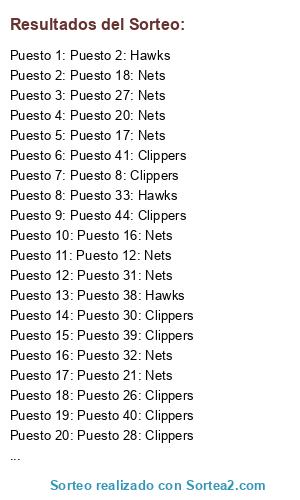 Lista de participantes: Puesto 1: Nets, Puesto 2: Hawks, Puesto 3: Nets, Puesto 4: Nets, Puesto 5: Nets, Puesto 6: Clippers, Puesto 7: Nets, Puesto 8: Clippers, Puesto 9: Clippers, Puesto 10: Clippers, Puesto 11: Nets, Puesto 12: Nets, Puesto 13: Hawks, Puesto 14: Clippers, Puesto 15: Clippers, Puesto 16: Nets, Puesto 17: Nets, Puesto 18: Nets, Puesto 19: Clippers, Puesto 20: Nets, Puesto 21: Nets, Puesto 22: Nets, Puesto 23: Hawks, Puesto 24: Nets, Puesto 25: Hawks, Puesto 26: Clippers, Puesto 27: Nets, Puesto 28: Clippers, Puesto 29: Hawks, Puesto 30: Clippers, Puesto 31: Nets, Puesto 32: Nets, Puesto 33: Hawks, Puesto 34: Nets, Puesto 35: Hawks, Puesto 36: Nets, Puesto 37: Nets, Puesto 38: Hawks, Puesto 39: Clippers, Puesto 40: Clippers, Puesto 41: Clippers, Puesto 42: Hawks, Puesto 43: Hawks, Puesto 44: Clippers, Puesto 45: Nets.