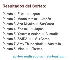 Lista de participantes: Elle Japón, Enako Japón, Momoiroreku Japón, Aza Miyuko SurCorea, SAIDA SurCorea, Misa Taiwan, Amy Thunderbolt Australia, Yasemin Arslan Australia.