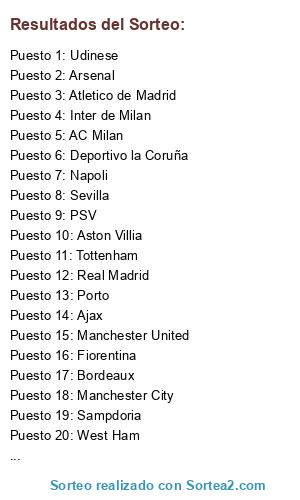 Lista de participantes: Arsenal, Barcelona, Manchester United, Real Madrid, Chelsea, Inter de Milan, AC Milan, Valencia, Liverpool, Manchester City, Juventus, Roma, Tottenham, Atletico de Madrid, Sevilla, Fiorentina, Aston Villia, Everton, Villarreal, Genoa, Marsella, Porto, Deportivo la Coruña, Benfica, Sampdoria, PSV, Ajax, Udinese, Napoli, Bordeaux, Galastasaray, West Ham.