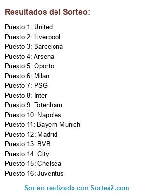 Lista de participantes: Oporto, Juventus, BVB, Barcelona, Madrid, Napoles, Milan, United, City, Bayern Munich, PSG, Chelsea, Inter, Totenham, Arsenal, Liverpool.