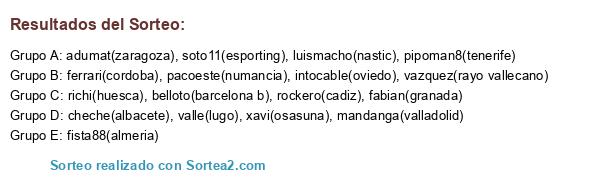 Lista de participantes: pipoman8(tenerife), rockero(cadiz), fabian(granada), vazquez(rayo vallecano), soto11(esporting), belloto(barcelona b), xavi(osasuna), ferrari(cordoba), intocable(oviedo), richi(huesca), adumat(zaragoza), luismacho(nastic), mandanga(valladolid), fista88(almeria), pacoeste(numancia), valle(lugo), cheche(albacete).