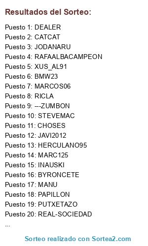 Lista de participantes: REAL-SOCIEDAD, JODANARU, FPMARTIN, JOAGONCOR, MANU, CORSARIO NEGRO, ALFA NOIA, PIRLIN, CHOSES, HERCULANO95, RAFAALBACAMPEON, JAVILONN, PUTXETAZO, STEVEMAC, LP_6, RICLA, TITOROBERT69, PACO_ILICITANO, ---ZUMBON, MARCOS06, ALDURFE, PAPILLON, JAVI2012, JOSED, OSCARGAR, OSANDIE, XUS_AL91, CACO, PELAGARTO, BMW23, XESCO, LUY_, CATCAT, BYRONCETE, INAUSKI, DEALER, MARC125, LEREIRES.