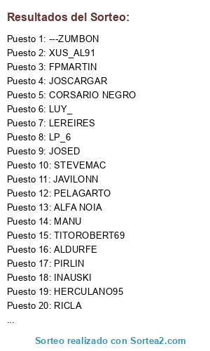 Lista de participantes: JOSCARGAR, ---ZUMBON, PUTXETAZO, JOSED, PELAGARTO, FPMARTIN, DEALER, LUY_, BYRONCETE, PACO_ILICITANO, PAPILLON, MARC125, ALDURFE, JOAGONCOR, MARCOS06, BMW23, XUS_AL91, LEREIRES, MANU, TITOROBERT69, OSANDIE, JAVI2012, RICLA, XESCO, HERCULANO95, JODANARU, STEVEMAC, LP_6, CORSARIO NEGRO, RAFAALBACAMPEON, CATCAT, PIRLIN, JAVILONN, INAUSKI, CHOSES, ALFA NOIA.