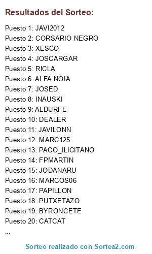Lista de participantes: ---ZUMBON, JOSCARGAR, XUS_AL91, PUTXETAZO, DEALER, PACO_ILICITANO, FPMARTIN, MARCOS06, MANU, JOSED, ALDURFE, OSANDIE, JAVI2012, BYRONCETE, MARC125, RICLA, TITOROBERT69, JOAGONCOR, LUY_, BMW23, RAFAALBACAMPEON, HERCULANO95, PELAGARTO, LEREIRES, XESCO, PAPILLON, PIRLIN, INAUSKI, JODANARU, CORSARIO NEGRO, CATCAT, STEVEMAC, ALFA NOIA, LP_6, JAVILONN, CHOSES.
