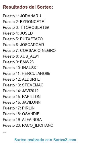 Lista de participantes: MARC125, MANU, MARCOS06, CHOSES, XUS_AL91, JOSED, RICLA, OSANDIE, PIRLIN, CORSARIO NEGRO, LUY_, JOSCARGAR, STEVEMAC, PACO_ILICITANO, RAFAALBACAMPEON, LP_6, BYRONCETE, JOAGONCOR, DEALER, FPMARTIN, CATCAT, HERCULANO95, LEREIRES, JAVI2012, ALDURFE, PUTXETAZO, XESCO, PELAGARTO, JAVILONN, TITOROBERT69, ---ZUMBON, JODANARU, PAPILLON, BMW23, INAUSKI, ALFA NOIA.
