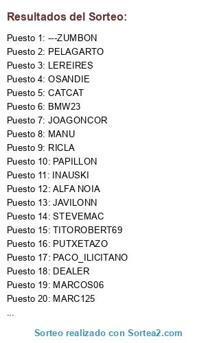 Lista de participantes: JOSCARGAR, OSANDIE, XUS_AL91, MARC125, DEALER, JOSED, XESCO, ALDURFE, PACO_ILICITANO, PUTXETAZO, FPMARTIN, ---ZUMBON, LP_6, PELAGARTO, LEREIRES, MANU, CHOSES, PIRLIN, BYRONCETE, LUY_, JODANARU, TITOROBERT69, HERCULANO95, JAVI2012, STEVEMAC, MARCOS06, RICLA, BMW23, CATCAT, CORSARIO NEGRO, JOAGONCOR, INAUSKI, ALFA NOIA, RAFAALBACAMPEON, PAPILLON, JAVILONN.