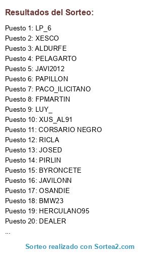 Lista de participantes: JOSCARGAR, XUS_AL91, OSANDIE, MARC125, DEALER, JOSED, ALDURFE, FPMARTIN, XESCO, ---ZUMBON, PELAGARTO, PUTXETAZO, PACO_ILICITANO, LP_6, MANU, LEREIRES, BYRONCETE, JODANARU, TITOROBERT69, LUY_, PIRLIN, CHOSES, JAVI2012, HERCULANO95, MARCOS06, STEVEMAC, RICLA, BMW23, CATCAT, JOAGONCOR, CORSARIO NEGRO, RAFAALBACAMPEON, INAUSKI, ALFA NOIA, PAPILLON, JAVILONN.