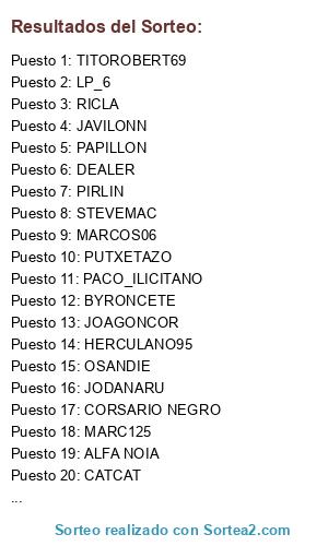 Lista de participantes: MARCOS06, OSANDIE, JOSED, STEVEMAC, MARC125, XUS_AL91, XESCO, JOSCARGAR, MANU, PIRLIN, CORSARIO NEGRO, CHOSES, CATCAT, LUY_, HERCULANO95, RICLA, RAFAALBACAMPEON, FPMARTIN, JODANARU, JAVI2012, PACO_ILICITANO, JOAGONCOR, LP_6, PUTXETAZO, LEREIRES, DEALER, ALDURFE, JAVILONN, ---ZUMBON, INAUSKI, BYRONCETE, TITOROBERT69, PAPILLON, PELAGARTO, ALFA NOIA, BMW23.