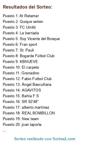 Lista de participantes: Samu, Granadino, New team, Bahía F S, At Retamar, joan laporta, Fran sport, AGAVITOS, Ángel Bascuñana, alberto martínez, El carpeta, REAL BOMBILLON, Soy Vicente del Bosque, KBNUEVE, La barriada, Quique setien, Ad ceuta, FC Umtiti, Fabio Futbol Club, UD LOS BARRIOS, Bogarde Fútbol Club, St. Pauli, SR 92'48'', Espartano.