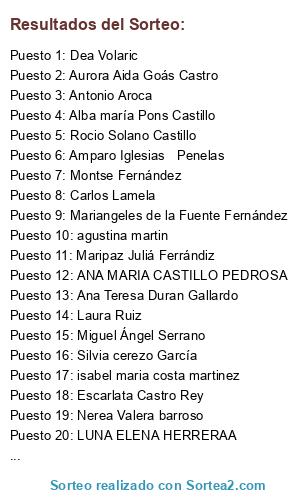 Lista de participantes: Abdelghani El Harrati, Abdennour Khayat, abel cardiel blanco, abraham rider, Abraham Veciana Gutierrez(2), Adela Mateo Acero, adeli Barrera Perez, Adolfo Granados moreno, Adoracion Pérez Nieto, Adri Garcia, Adrian Badenes garcia, adrian saques florez, Adrián Martínez García, Adriana Diaz Irache, Adriana Fernandez, Adriana Uribe, Agripina Olivan, agustin florido beltran, Agustina Caballero Soriano, agustina Cañamero Ontoria, Agustina Hernández García, agustina martin, Aida Diaz, AIda Estrada petrus, Aida Lopez, Aida Vicente RUBIO, Ainara Morante carrasco, ainhoa amaia(2), Ainhoa Lazarraga Lahuerta, Ainoa Cayetano Torres, Aitana martínez, Aitana Velo Serantes, Aitana Zubeldia diaz, Aitor garcia, Aixa Acevedo rivera, Alba Enriquez fernandez, Alba Hernanz MORALES, aLBA mIRANDA, Alba Pereña Fernández, Alba Sastre, Alba iris Martinez martinez, Alba María Baños Pérez, Alba maría Pons Castillo, Albert Ballell, Albert Cendros rebel, ALBERTO campos de miguel, Alberto Fontenla butragueño, Alberto Garcia Naya, alberto gimeno ferrer, Alberto González, Alberto Rodriguez, Alberto Serrat serret, Alberto Silva martinez, alberto tirado rodriguez(2), Alberto Valenzuela, Alberto Vidal Troitiño, Alejandra Garcia guerrero, Alejandra Rosero Ortega, Alejandro Cuartero, Alejandro Leon rodriguez, Alejandro Reig(3 participaciones), Alex Vallés(2), Alexandra Herrera, ALEXANDRA martinez silva(2), Alexandra Peña sanchez, Alexandra Rico González, ALEXIA lara, Alexis romero lozano, Alfredo Beaumont Saez, Alicia Andújar Gil, Alicia Caro, Alicia Cortés PALLERO, Alicia Esteban, Alicia Fernandez(2), Alicia Garcia, Alicia Hombrados Elbal, Alicia luque Valencia, Alicia Milan, Alicia Millan, Alicia Moreno Quintana, Alicia Muñoz peRez, Alicia pozo garcia, Alicia Rodríguez ramos, Alicia Sastre Quiroga, Alicia Segui, Alicia Zorita Nieto, Allyson Rodriguez Carpio, Almudena Arnal Estelles, Almudena Caballero Santana, Almudena Carretero, Almudena Lorite Mas, almudena ortega, Almudena Perez calvillo, álvaro Gómez trigo, amagoia sanchez, AMALIO MARTINEZ DELGADO, amaya regidor de los angeles, Amber Aguilera freitag, Amelia Riera Tur, amor sanchez, Ampa asuncion, Ampa Delasunci, ampar Asuncion(3), Amparo Abad Marco, amparo asuncion, Amparo C, Amparo Calatayud Murillo, Amparo Delasu, amparo galan, Amparo Hermila(2 participaciones), Amparo Iglesias Penelas(2), Amparo Luzon, Amparo Marti Pueyo, Amparo martin morales, Amparo Mistica, Amparo Peña Maestre, Amparo Quilis, AMPARO QUILIS GIMENO, Amparo Sinisterra, Amparo talens, Amparo valls clofent, Amparo Vites Miranda(2), Ana Abad, Ana Abad TOMÁS, Ana Alonso, Ana Alonso Coello(2), Ana Ambite Taracido, ANA ANGULO LOPEZ, Ana Aranda, ANA ARRIETA SANCHEZ, ana baraza, Ana Barranquero GonZalez, Ana Berea julia, Ana Bermell, ana bertol, Ana Blanco, Ana Brisa, ana bustos rodriguez, Ana Cabrero(2), Ana Calleja Sanchez, Ana Castelblanque, Ana Chánobas Val, ana cintora quero, Ana Coll homet, Ana Colomer Pla, ana de la Iglesia Reglero, Ana Del amor, ana delgado de la fuente, Ana Estela chacon(2), ANA FERNANDEZ, Ana GARGALLO CASTEL, Ana Gomez, Ana Herrera Ruiz, Ana Herrero Curiel, Ana Jaraba, ANA LEGARRA MUÑOA, ana lopez cazorla, Ana Mascarell OLASO(2), Ana Meléndez Saldaña, ana moreno de matias, ANA MORILLA ANDRADE, ANA MUÑOZ, Ana Núñez Vargas, ana ortega camps(2), ANA pascual DE BENITO, ana pegito(2), ana rodriguez garcia, ANA romero(2), ana Sanchez, Ana Serra Carrera, ANa Siurana pérez, Ana Sobejano, Ana Solera jimenez, Ana Trullenque ruiz, ana valer pelarda, Ana Vazquez, Ana Vera Garbajosa, ana belen aviles martinez, Ana Belen Gonzalez Mariñosa, ana belen lopez, Ana Belén CARBAYO PRIETO, Ana Belén Chamizo Jurado(2), Ana Cristina Sánchez peña, Ana Isabel Garmendia AguTirre, Ana Isabel Hernández Martín, Ana Isabel López Espinosa, ana isabel suescun basarte, ANA LUCYA LEGARDA CEBALLOS(2), Ana maria Bazan lopez, Ana maria Cano granado, ANA Maria Carnicero Rodriguez, ANA MARIA CASTILLO PEDROSA, Ana maria De LERA torollo, Ana Maria Fernandez Moreno, Ana Maria Lucaci, ANA MARIA MARTIN GOMEZ, Ana Maria Martinez Moreno(2), Ana maria perez gonzalez, ana maria puente jaramillo, Ana MARÍA Guardabrazo pedroche, Ana María Manjón Arroyo, Ana María Navarro Hernández, Ana Mercedes Benito, Ana Teresa Duran Gallardo, Anabel Alburquerque García, ANABEL OCON RUIZ(2), Andoni De Arriezu, Andrea Fernández Gálvez, Andrea Sueiro zurita, Andrea Aparecida Muñoz ferreirs, ANDREA CAROLINA Diaz REYES, ANDRES GONZALEZ PEREZ, ANDRES Madrid Sanz, andres perez perez, Ane Berasaluce, ane irigoyen hernandez, angel Aranda(2), ANGEL CARPIO CHACON, Angel Chamizo Moreno, angel MANGADO, angel navas burcio, ANGEL JOSE RODRIGUEZ JUAREZ, ÁNGEL MARÍA FERNÁNDEZ IBÁÑEZ DE ALDECOA, Angela Caballé Noguer, angela campillo garrido, Angela Chamizo castilla(2), angela Luque campillo, Angela Martinez Prado, Angela RUBIO PALOMARES, angela sedanoc canalejas, ANGELA TORNE, Angela Rosa Ferre GARCIA, ANGELES CABALLERO, Angeles Diaz Baena, Angeles Giner VILLEGART, angeles villegart gimenez, ángeles maestro, Angelica FerNandez gonzalez, Angélica Blanco Talaván, Angélica Mesa Contreras, angels roda bailach, Angels Vilalta, ANNA BARRANCO, Anna Bonastre, Anna Cea Royes, anna Cerdà camats, Anna civis Vals(2), Anna Orga gamez, ANNA MARIA CORBELLA SAVALL, Annie LEBLOND, Antonia Álvarez García(2), antonia cabanillas garcia, Antonia Gómez muñoz, Antonia Menacho, Antonia nieto jurdao, ANTONIA RIVAS ZUÑIGA, Antonio Aroca(8), Antonio Beltran, antonio cerda sanchez, Antonio Cezon Navarro, Antonio doña suuarez, Antonio Fernández Sánchez, ANTONIO GALAN ROMAN, Antonio Garcia, Antonio gayubo nebreda, Antonio Lobato, Antonio López Ruiz, Antonio LOPEZ Suárez, ANTONIO MARTINEZ LEAL(2), Antonio Menacho, Antonio Miranda(5), Antonio Muñoz Sánchez, antonio offroy aguinaga, Antonio parras jimenez, Antonio Peirado Gómez, antonio roldan gamero, Antonio Segura Sedeño, Antonio Sinisterra,