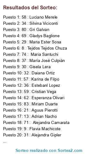 Lista de participantes: 1 Erica P Ponce, 2 Eugenia Cordoba, 3 Silvana Iriondo, 4 Lamboglia Liliana, 5 Fabian Kern, 6 Sabrina Gipler, 7 Blanquería La Paz, 8 Tejidos Tejidos Chuza, 9 Flavia Machicote, 10 Mariela Sotelo, 11 Alex Mansiilla, 12 Rosy Hering, 13 Adrian Nacho, 14 Nidia Martinez, 15 Naty Cent, 16 Rosa Carrizo, 17 Gri Galvan, 18 Cecilia Diaz, 19 Nata Garnier, 20 Elena Del Pilar, 21 Aguus Pierotti, 22 Noe Buffa Lmds, 23 Laura Barroso, 24 Luciana Ceparo, 25 Leila Curá, 26 Lore Silioni, 27 LA Morocha Aguirre, 28 Vanesa Etchebehere, 29 Maria Ester Sosa, 30 Gisela Lera, 31 Alejandra Gipler, 32 Daiana Ortiz, 33 Sony la Morocha, 34 Silvina Viciconti, 35 Adriana Alejandra Cardozo, 36 Estebanl Lopez, 37 María José Culpián, 38 Melii Uriondo, 39 Maxi Liberatori , 40 Mariel Barbero, 41 Mikaa Lopez, 42 Belu Flores , 43 Clarisa Alejandra Rodas, 44 Gabriela Terzaghi, 45 Maria Balbin, 46 Monica Pastorini, 47 Marce Kreiter, 48 Maria Paula Marc, 49 Luciana Schröder, 50 Catalina Maidana , 51 Diego Gabriel Torales, 52 Erica Silvetti, 53 Soledad Beltramelli, 54 Maria Santuchi, 55 Karii Diaz, 56 Susana Puig, 57 Karina de Filpo, 58 Luciano Merele, 59 Cristian Vega, 60 Anitha Paiz, 61 Javi Franco, 62 Esperanza Olivari, 63 Laura Barroso , 64 Maria Gilardi , 65 Andrea Elisabeth Sola , 66 Mercedes Nazar Bernaudo , 67 Alejandra Gipler , 68 Elsa Baez , 69 Gladys Baglione , 70 Tània MJ , 71 Alejandra Camarata , 72 Liliana Inés Fridman , 73 Susana Puig , 74 Maria Santuchi , 75 Nelida Lamboglia, 76 Mariel Barbero , 77 Pichon Mujica , 78 Gabriela Terzaghi , 79 Fabian Kern , 80 Gri Galvan , 81 Erica P Ponce , 82 Marce Kreiter , 83 Miriam Duarte , 84 Noe Buffa Lmds, 85 Campanita Fiestas, .