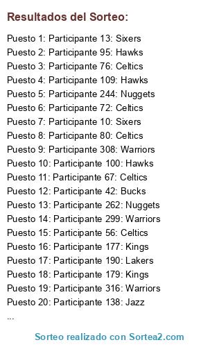 Lista de participantes: Participante 1: Sixers, Participante 2: Sixers, Participante 3: Sixers, Participante 4: Sixers, Participante 5: Sixers, Participante 6: Sixers, Participante 7: Sixers, Participante 8: Sixers, Participante 9: Sixers, Participante 10: Sixers, Participante 11: Sixers, Participante 12: Sixers, Participante 13: Sixers, Participante 14: Sixers, Participante 15: Sixers, Participante 16: Sixers, Participante 17: Sixers, Participante 18: Bucks, Participante 19: Bucks, Participante 20: Bucks, Participante 21: Bucks, Participante 22: Bucks, Participante 23: Bucks, Participante 24: Bucks, Participante 25: Bucks, Participante 26: Bucks, Participante 27: Bucks, Participante 28: Bucks, Participante 29: Bucks, Participante 30: Bucks, Participante 31: Bucks, Participante 32: Bucks, Participante 33: Bucks, Participante 34: Bucks, Participante 35: Bucks, Participante 36: Bucks, Participante 37: Bucks, Participante 38: Bucks, Participante 39: Bucks, Participante 40: Bucks, Participante 41: Bucks, Participante 42: Bucks, Participante 43: Bucks, Participante 44: Bucks, Participante 45: Bucks, Participante 46: Bucks, Participante 47: Bucks, Participante 48: Bucks, Participante 49: Bucks, Participante 50: Bucks, Participante 51: Bucks, Participante 52: Bucks, Participante 53: Bucks, Participante 54: Bucks, Participante 55: Celtics, Participante 56: Celtics, Participante 57: Celtics, Participante 58: Celtics, Participante 59: Celtics, Participante 60: Celtics, Participante 61: Celtics, Participante 62: Celtics, Participante 63: Celtics, Participante 64: Celtics, Participante 65: Celtics, Participante 66: Celtics, Participante 67: Celtics, Participante 68: Celtics, Participante 69: Celtics, Participante 70: Celtics, Participante 71: Celtics, Participante 72: Celtics, Participante 73: Celtics, Participante 74: Celtics, Participante 75: Celtics, Participante 76: Celtics, Participante 77: Celtics, Participante 78: Celtics, Participante 79: Celtics, Participante 80: Celtics, Participante 81: Celtics, Participante 82: Celtics, Participante 83: Celtics, Participante 84: Celtics, Participante 85: Celtics, Participante 86: Celtics, Participante 87: Celtics, Participante 88: Celtics, Participante 89: Celtics, Participante 90: Celtics, Participante 91: Celtics, Participante 92: Hawks, Participante 93: Hawks, Participante 94: Hawks, Participante 95: Hawks, Participante 96: Hawks, Participante 97: Hawks, Participante 98: Hawks, Participante 99: Hawks, Participante 100: Hawks, Participante 101: Hawks, Participante 102: Hawks, Participante 103: Hawks, Participante 104: Hawks, Participante 105: Hawks, Participante 106: Hawks, Participante 107: Hawks, Participante 108: Hawks, Participante 109: Hawks, Participante 110: Hawks, Participante 111: Jazz, Participante 112: Jazz, Participante 113: Jazz, Participante 114: Jazz, Participante 115: Jazz, Participante 116: Jazz, Participante 117: Jazz, Participante 118: Jazz, Participante 119: Jazz, Participante 120: Jazz, Participante 121: Jazz, Participante 122: Jazz, Participante 123: Jazz, Participante 124: Jazz, Participante 125: Jazz, Participante 126: Jazz, Participante 127: Jazz, Participante 128: Jazz, Participante 129: Jazz, Participante 130: Jazz, Participante 131: Jazz, Participante 132: Jazz, Participante 133: Jazz, Participante 134: Jazz, Participante 135: Jazz, Participante 136: Jazz, Participante 137: Jazz, Participante 138: Jazz, Participante 139: Jazz, Participante 140: Jazz, Participante 141: Kings, Participante 142: Kings, Participante 143: Kings, Participante 144: Kings, Participante 145: Kings, Participante 146: Kings, Participante 147: Kings, Participante 148: Kings, Participante 149: Kings, Participante 150: Kings, Participante 151: Kings, Participante 152: Kings, Participante 153: Kings, Participante 154: Kings, Participante 155: Kings, Participante 156: Kings, Participante 157: Kings, Participante 158: Kings, Participante 159: Kings, Participante 160: Kings, Participante 161: Kings, Participante 162: Kings, Participante 163: Kings, Participante 164: Kings, Participante 165: Kings, Participante 166: Kings, Participante 167: Kings, Participante 168: Kings, Participante 169: Kings, Participante 170: Kings, Participante 171: Kings, Participante 172: Kings, Participante 173: Kings, Participante 174: Kings, Participante 175: Kings, Participante 176: Kings, Participante 177: Kings, Participante 178: Kings, Participante 179: Kings, Participante 180: Kings, Participante 181: Kings, Participante 182: Kings, Participante 183: Kings, Participante 184: Kings, Participante 185: Kings, Participante 186: Kings, Participante 187: Lakers, Participante 188: Lakers, Participante 189: Lakers, Participante 190: Lakers, Participante 191: Lakers, Participante 192: Lakers, Participante 193: Lakers, Participante 194: Lakers, Participante 195: Lakers, Participante 196: Lakers, Participante 197: Lakers, Participante 198: Lakers, Participante 199: Lakers, Participante 200: Lakers, Participante 201: Lakers, Participante 202: Lakers, Participante 203: Lakers, Participante 204: Lakers, Participante 205: Lakers, Participante 206: Lakers, Participante 207: Lakers, Participante 208: Lakers, Participante 209: Lakers, Participante 210: Lakers, Participante 211: Lakers, Participante 212: Lakers, Participante 213: Lakers, Participante 214: Lakers, Participante 215: Lakers, Participante 216: Magic, Participante 217: Magic, Participante 218: Magic, Participante 219: Magic, Participante 220: Magic, Participante 221: Magic, Participante 222: Magic, Participante 223: Magic, Participante 224: Magic, Participante 225: Magic, Participante 226: Magic, Participante 227: Magic, Participante 228: Magic, Participante 229: Magic, Participante 230: Magic, Participante 231: Magic, Participante 232: Magic, Participante 233: Magic, Participante 234: Magic, Participante 235: Magic, Participante 236: Magic, Participante 237: Magic, Participante 238: Magic, Participante 239: Nuggets, Participante 240: