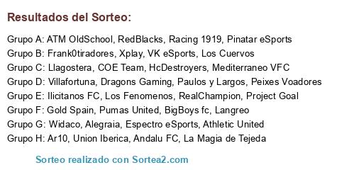 Lista de participantes: Langreo, RedBlacks, Athletic United, Widaco, Union Iberica, Mediterraneo VFC, VK eSports, Racing 1919, Ilicitanos FC, HcDestroyers, Llagostera, Pinatar eSports, RealChampion, ATM OldSchool, Villafortuna, Espectro eSports, Los Cuervos, La Magia de Tejeda, Los Fenomenos, Alegraia, Xplay, COE Team, BigBoys fc, Frank0tiradores, Andalu FC, Paulos y Largos, Project Goal, Gold Spain, Dragons Gaming, Peixes Voadores, Ar10, Pumas United.