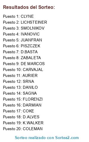 Lista de participantes: D.ALVES, ZABALETA, LICHSTEINER, CARVAJAL, DANILO, DARMIAN, COLEMAN, JUANFRAN, SRNA, AURIER, CLYNE, DE MARCOS, SMOLNIKOV, IVANOVIC, PISZCZEK, COKE, D.BASTA, FLORENZI, K.WALKER, SAGNA.