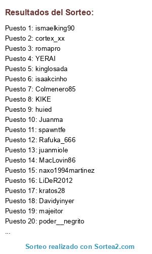 Lista de participantes: LiDeR2012, Davidyinyer, Colmenero85, romapro, kratos28, majeitor, poder__negrito, MacLovin86, Juanma, capitanflipi, ismaelking90, cortex_xx, huied, juanmiole, Rafuka_666, kinglosada, spawntfe, YERAI, RUII, KIKE, naxo1994martinez, isaakcinho.