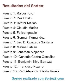 Lista de participantes: Felipe Ignacio, Matías Fabián, Jonathan Alejandro, Pes Chalo, Hector Matias, Germán Fernández, Gonzalo Castro González, Raigor Toro, Raúl Alejandro Cerda Rivera, Leo D. Quezada Santana, Francisco Pizarro, Benjamin Silva Barraza, Claudio Matías.