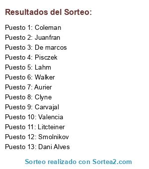 Lista de participantes: Carvajal, Lahm, Alves, Juanfran, Litchteiner, Pisczek, Aurier, Walker, Valencia, Clyne, Coleman, De marcos, Smolnikov.