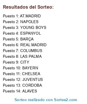 Lista de participantes: AT.MADRID, BAYERN, YOUNG BOYS, CHELSEA, COLUMBUS, CORDOBA, ALAVES, BARÇA, JUVENTUS, CITY, NAPOLES, ESPANYOL, REAL MADRID, LAS PALMA.