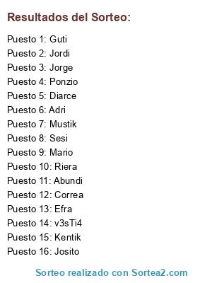 Lista de participantes: Guti, Jorge, Diarce, Ivan, Josito, Adri_twist, Efrain, Adri, Sesi, Sack, V3sti4, Mustik, Mario, Jhor, Ponzio, Correa, Mike, Jordi.