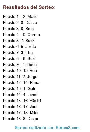 Lista de participantes: 1: Guti, 2: Jorge, 3: Efra, 4: Jonsi, 5: Josito, 6: Sete, 7: Sack, 8: Diego, 9: Diarce, 10: Correa, 11: Boen, 12: Mario, 13: Adri, 14: Riera, 15: Mike, 16: v3sTi4, 17: Jordi, 18: Sesi.