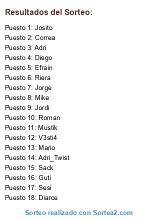 Lista de participantes: Adri, Roman, Guti, Jordi, Mario, Sack, Jorge, Mustik, Riera, Diego, V3sti4, Adri_Twist, Correa, Diarce, Efrain, Sesi, Mike, Josito.