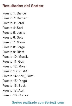 Lista de participantes: Jorge, Adri_Twist, Adri, Jordi, Diarce, Mike, Riera, Roman, Mario, Mustik, Diego, Sesi, Josito, Guti, Sack, Correa, Sete, V3sti4.