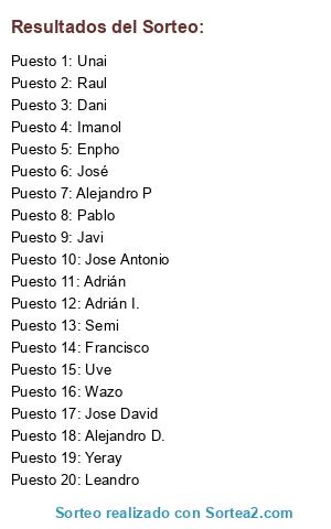 Lista de participantes: Alejandro D., Imanol, Alejandro P, Pablo, José, Jose David, Unai, Yeray, Adrián, Semi, Leandro, Enpho, Javi, Francisco, Raul, Adrián I., Jose Antonio, Wazo, Uve, Dani.