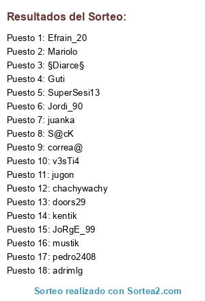 Lista de participantes: javiii_11 , oskis, almarcle, Sergioo10, mark_17, ivancinho004, BRT21, kitsune11, jamo, Ivánzovik, TITI_AXEL_14, Bass120, Fiorano, Sarkus, Oskarjugon, Antoninho, Valero10, Enov, Barambambiron, Zarco, adrian_xta, ivan_9, Nevi, awesomefifa10, aritz1996, juanmasfc, Al_pacino, litos_better, ayo17, klis14.