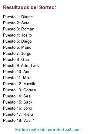 Lista de participantes: Jorge, Adri_Twist, Adri, Jordi, Diarce, Mike, Riera, Roman, Mario, Mustik, Diego, Sesi, Josito, Guti, Sack, Correa, Sete, V3sti4.