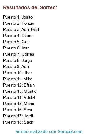 Lista de participantes: Guti, Jorge, Diarce, Ivan, Josito, Adri_twist, Efrain, Adri, Sesi, Sack, V3sti4, Mustik, Mario, Jhor, Ponzio, Correa, Mike, Jordi.