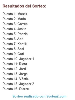 Lista de participantes: V3sti4, Guti, Ponzio, Sesi, Mario, Adri, Kentik, Jordi, Jorge, Riera, Mustik, Jugador 1, Josito, Correa, Diarce, Jugador 2.