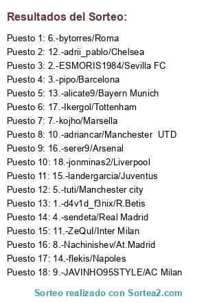 Lista de participantes: 1.-d4v1d_f3nix/R.Betis, 2.-ESMORIS1984/Sevilla FC, 3.-pipo/Barcelona, 4.-sendeta/Real Madrid, 5.-tuti/Manchester city, 6.-bytorres/Roma, 7.-kojho/Marsella, 8.-Nachinishev/At.Madrid, 9.-JAVINHO95STYLE/AC Milan, 10.-adriancar/Manchester UTD, 11.-ZeQuI/Inter Milan, 12.-adrii_pablo/Chelsea, 13.-alicate9/Bayern Munich, 14.-flekis/Napoles, 15.-landergarcia/Juventus, 16.-serer9/Arsenal, 17.-Ikergol/Tottenham, 18.-jonminas2/Liverpool.