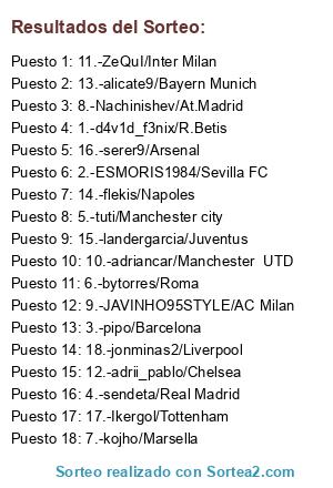 Lista de participantes: 1.-d4v1d_f3nix/R.Betis, 2.-ESMORIS1984/Sevilla FC, 3.-pipo/Barcelona, 4.-sendeta/Real Madrid, 5.-tuti/Manchester city, 6.-bytorres/Roma, 7.-kojho/Marsella, 8.-Nachinishev/At.Madrid, 9.-JAVINHO95STYLE/AC Milan, 10.-adriancar/Manchester UTD, 11.-ZeQuI/Inter Milan, 12.-adrii_pablo/Chelsea, 13.-alicate9/Bayern Munich, 14.-flekis/Napoles, 15.-landergarcia/Juventus, 16.-serer9/Arsenal, 17.-Ikergol/Tottenham, 18.-jonminas2/Liverpool.