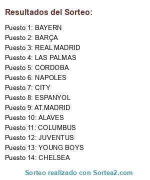 Lista de participantes: AT.MADRID, BAYERN, YOUNG BOYS, CHELSEA, COLUMBUS, CORDOBA, ALAVES, BARÇA, JUVENTUS, CITY, NAPOLES, ESPANYOL, REAL MADRID, LAS PALMAS.