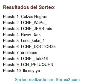 Lista de participantes: Reviv-Dark, LCNE_JERR-hds, LCN_PELUQUEN, LCNE_DOCTOR38, oriolboos, LCNE _ luk316, Lcne_koke_1, LCNE_WaPu_, Calzas Negras, llo soy yo.