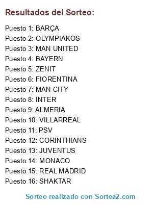 Lista de participantes: VILLARREAL, FIORENTINA, SHAKTAR, PSV, JUVENTUS, ZENIT, BAYERN, MAN CITY, OLYMPIAKOS, ALMERIA, MONACO, INTER, BARÇA, REAL MADRID, CORINTHIANS, MAN UNITED.