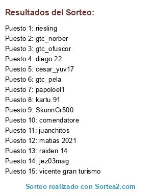 Lista de participantes: gtc_pela, gtc_ofuscor, gtc_norber, comendatore, papoloel1, riesling, vicente gran turismo, diego 22, jez03mag, raiden 14, matias 2021, SkunnCr500, juanchitos, kartu 91, cesar_yuv17.