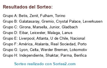 Lista de participantes: Gladbach, Parma, Leverkusen, Benfica, Atlanta, Zenit, América, Lanus, Fulham, Shaktar, Celta, Lyon, Crystal Palace, Betis, Leicester, Porto, Lokomotiv, Atalanta, Junior, Real Sociedad, U de Chile, Nacional, Eibar, Malaga, Galatasaray, Marsella, Independiente, Girona, Werder Bremen, Liverpool, Gremio, Torino.
