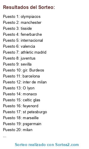 Lista de participantes: barcelona, villareal, manchester, liverpol, O lyon, atleti bilbao, monaco, juventus, Roma, Boca, betis, st petesburgo, internacional, gir. Burdeos, celtic glas, madrid, inter de milan, athletic madrid, milan, sevilla, valencia, chelsea, arsenal, fenerbarche, torino, marseille, olympiacos, napoles, feyenord, man blue, tisside, psgermain.