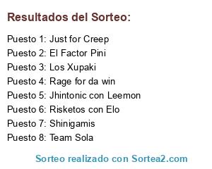Lista de participantes: Just for Creep, Rage for da win, Team Sola, Shinigamis, El Factor Pini, Risketos con Elo, Los Xupaki, Jhintonic con Leemon.
