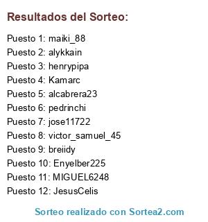 Lista de participantes: alcabrera23, alykkain, breiidy, Enyelber225, henrypipa, JesusCelis, jose11722, Kamarc, maiki_88, MIGUEL6248, pedrinchi, victor_samuel_45.