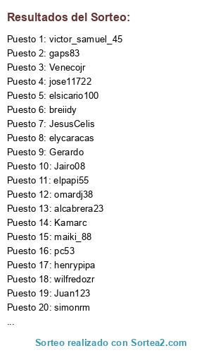 Lista de participantes: agt07, alcabrera23, breiidy, elpapi55, elsicario100, elycaracas, gaps83, Gerardo, henrypipa, Jairo08, JesusCelis, jonanyerber, jose11722, Juan123, Kamarc, maiki_88, omardj38, pc53, pedrinchi, simonrm, SORTI, Venecojr, victor_samuel_45, wilfredozr.