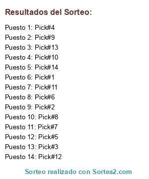 Lista de participantes: Pick#1, Pick#2, Pick#3, Pick#4, Pick#5, Pick#6, Pick#7, Pick#8, Pick#9, Pick#10, Pick#11, Pick#12, Pick#13, Pick#14.