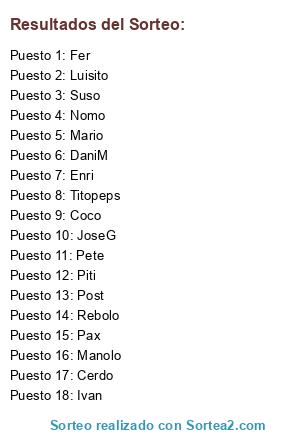 Lista de participantes: Fer, Suso, Pax, Cerdo, Pete, DaniM, Rebolo, Nomo, Mario, Piti, Titopeps, Manolo, Post, Ivan, Luisito, Coco, JoseG, Enri.