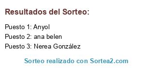 Lista de participantes: lola anton, estelblau, drissing, kelika, ana belen, Afilando mis tacones, Carmen, Maria Rosa, tapujos, Jessi, Xandra, MONICA QUESADA, Anyol, hueleacoco, Nerea González, xusita sanz, NuRya G. (en Facebook: Nuria Garcia Buendia), JARF8, Ali75.