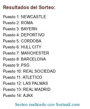 Lista de participantes: MANCHESTER, DEPORTIVO, REAL MADRID, ATLETICO, BARCELONA, PSG, AJAX, HULL CITY, BAYERN, CORDOBA, NEWCASTLE, LAS PALMAS, ROMA, REAL SOCIEDAD.