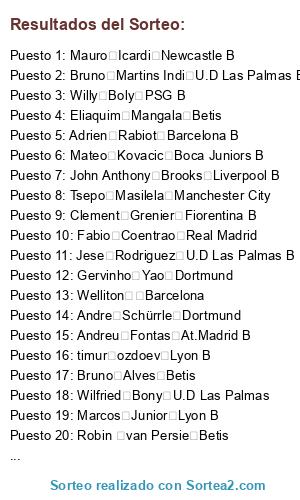 Lista de participantes: Julio Cesar AC MILAN, Pepe Reina AC MILAN, Cristian Eriksen AC MILAN, Jeremy Menez AC MILAN, Adel Taarabt AC MILAN, Elias Mendez AC MILAN, Lass Diarra AC MILAN, Antonio Nocerino AC MILAN, Ilkay Gundogan AC MILAN, Kevin Constant AC MILAN, Juanfran Torres AC MILAN, Erik Lamela AC MILAN, Bernard Anicio AC MILAN, osvaldo Lourenco AC MILAN, Arjen Robben AC MILAN, Juan Cuadrado AC MILAN, Mehdi Benatia AC MILAN, Andrea Barzagli AC MILAN, Giuseppe Rossi AC MILAN, Zatlan Ibrahimovic AC MILAN, Antonio Di Natale AC MILAN, Antonio Cassano AC MILAN, Jose Paulo Paulinho AC MILAN, Mattia Perin AC MILAN B, Stefanos Kapino AC MILAN B, James McCarthy AC MILAN B, Gaèl Kakuta AC MILAN B, Adam Maher AC MILAN B, Pape Camara AC MILAN B, Jose luis Zezinho AC MILAN B, Dennis Diekmeier AC MILAN B, Thomas Ince AC MILAN B, Maicon Marques AC MILAN B, Gabriel Torje AC MILAN B, Georginio Wijnaldum AC MILAN B, Armindo Bruma AC MILAN B, Jores Okore AC MILAN B, Cheikhou Kouyate AC MILAN B, Juan Jesus AC MILAN B, Nicolas Lopez AC MILAN B, Leo Baptistao AC MILAN B, Ibrahima Mbaye AC MILAN B, Kurt Zouma AC MILAN B, Petr Cech Fiorentina, Fabio Maciel Fiorentina, Andres D'Alessandro Fiorentina, Santi Cazorla Fiorentina, Tino Costa Fiorentina, Luiz Gustavo Fiorentina, Fredy Guarin Fiorentina, Kevin De Bruyne Fiorentina, Thiago Alcantara Fiorentina, Juan Vargas Fiorentina, Gokhan Gonul Fiorentina, Eden Hazard Fiorentina, Johan Djourou Fiorentina, Angelo Ogbonna Fiorentina, Stephane M'Bia Fiorentina, Mapou Yanga-Mbiwa Fiorentina, Soldado Fiorentina, Klaas-Jan Huntelaar Fiorentina, Andy Carroll Fiorentina, Javier Chicharito Fiorentina, Edinson Cavani Fiorentina, Timo Horn Fiorentina B, Christian Clemens Fiorentina B, Danilo Fiorentina B, Roberto Firmino Fiorentina B, Marco Van Ginkel Fiorentina B, Clement Grenier Fiorentina B, Pedro Obiang Fiorentina B, Juan Muñiz Fiorentina B, Frederik Sorensen Fiorentina B, Sheanon Williams Fiorentina B, Ryad Boudebouz Fiorentina B, Lass Bangoura Fiorentina B, Fraser Kerr Fiorentina B, Borja Lopez Fiorentina B, Alex Rubio Fiorentina B, Ciro Immobile Fiorentina B, Alexander Riemann Fiorentina B, Shawn Parker Fiorentina B, Manuel Neuer Arsenal, Bernd Leno Arsenal, Jack Wilshere Arsenal, Stephan El Shaarawy Arsenal, Luka Modric Arsenal, Blaise Matuidi Arsenal, Yann M'Vila Arsenal, Tom Cleverley Arsenal, Dani Alves Arsenal, Senad Lulic Arsenal, Aiden McGeady Arsenal, Carlos Vela Arsenal, Bryan Ruiz Arsenal, Dejan Lovren Arsenal, Mamadou Sakho Arsenal, Branislav Ivanovic Arsenal, Giorgio Chiellini Arsenal, Nemanja Vidic Arsenal, Radamel Falcao Arsenal, Hulk Arsenal, Burak Yilmaz Arsenal, Baptiste Reynet Arsenal B, Ali Ahamada Arsenal B, Matt Phillips Arsenal B, Alex Oxlade- Chamberlain Arsenal B, Joel Obi Arsenal B, Miralem Pjanic Arsenal B, Mubarak Wakaso Arsenal B, Thomas Drage Arsenal B, Konstantino Stafylidis Arsenal B, Diego Contento Arsenal B, Carl Jenkinson Arsenal B, Julian Koch Arsenal B, Cristian Tello Arsenal B, Lucas Andersen Arsenal B, Guilherme Negueba Arsenal B, Chris Smalling Arsenal B, Matija Nastasic Arsenal B, Gavin Gunning Arsenal B, Tomas Kalas Arsenal B, Connor Wickham Arsenal B, Jordan Ayew Arsenal B, Artur Moraes At.Madrid, Diego Lopez At.Madrid, Xherdan Shaqiri At.Madrid, Arda Turan At.Madrid, Jonathan Biabiany At.Madrid, Ander Herrera At.Madrid, Sven Bender At.Madrid, Joan Verdu At.Madrid, Carlos Eduardo At.Madrid, Pablo Armero At.Madrid, Marcelo At.Madrid, David Villa At.Madrid, Oscar De Marcos At.Madrid, Marko Arnautovic At.Madrid, Marvell Wynne At.Madrid, Laurent Koscielny At.Madrid, Bruno Ecuele Manga At.Madrid, Mattia Destro At.Madrid, Mauro Zárate At.Madrid, Carlos Tevez At.Madrid, Sergio Agüero At.Madrid, Fernando Torres At.Madrid, Toby Alderweireld At.Madrid, Mickey Van Der Hart At.Madrid B, Leonardo Bittencourt At.Madrid B, Sergio Canales At.Madrid B, Lucas Torro At.Madrid B, Pablo Sarabia At.Madrid B, Mateo Musacchio At.Madrid B, Terence Kongolo At.Madrid B, Dame N Doye At.Madrid B, Ignacio Camacho At.Madrid B, Michael Simoes Mika At.Madrid B, Lamine Gassama At.Madrid B, Leroy Fer At.Madrid B, Jonathan Dos Santos At.Madrid B, Harmeet Singh At.Madrid B, Matteo D'Alessandro At.Madrid B, Jozy Altidore At.Madrid B, Ibrahima Conte At.Madrid B, Andreu Fontas At.Madrid B, Simon Mignolet Barcelona, Stephane Ruffier Barcelona, danny Barcelona, Gaston Ramirez Barcelona, Rio Mavuba Barcelona, Joao Moutinho Barcelona, Yohan Cabaye Barcelona, Stefan Radu Barcelona, Cristian Ansaldi Barcelona, Marcos Luis Rocha Aquino Barcelona, Mbark Boussoufa Barcelona, Willian Borges da silva Barcelona, Taison Barcellos Freda Barcelona, N'koulou Ndouben Barcelona, Aymen Abdennour Barcelona, Gary Cahill Barcelona, Nicolas N'koulou Barcelona, Kevin Gameiro Barcelona, Jo Alves de assis silva Barcelona, Diego Costa Barcelona, Welliton Barcelona, Marco Sau Barcelona, Oscar dos Santos Barcelona, Nicola Leali Barcelona B, Granit Xhaka Barcelona B, Jesse Lingard Barcelona B, Luis Gil Barcelona B, Adrien Rabiot Barcelona B, Julian Draxler Barcelona B, Victor Wanyama Barcelona B, Casemiro Barcelona B, Jordan Lukaku Barcelona B, Calum Chambers Barcelona B, Nathan Redmond Barcelona B, Wellington Nem Barcelona B, Mitchell Weiser Barcelona B, Stefano Denswil Barcelona B, Diego Reyes Barcelona B, Luca Caldirola Barcelona B, Mory Kone Barcelona B, Horrit Hendrix Barcelona B, Alberto Paloschi Barcelona B, Josef Martinez Barcelona B, Nelson Oliveira Barcelona B, Fabio Borini Barcelona B, Marco Verratti Barcelona B, Kevin Trapp Betis, Michel Vorm Betis, Marko Marin Betis, Alan Dzagoev Betis, José Manuel Jurado Betis, Jose alberto Cañas Betis, Maxime Gonalons Betis, Beñat Etxebarria Betis, Anderson Betis, Leighton Baines Betis, Luke Shaw Betis, Jesus Gamez Betis, Martín Montoya Betis, Miroslav Stoch Betis, Manuel Nolito Betis, Joaquin Sanchez Betis, Pedro Rodriguez Betis, Eliaquim Mangala Betis, Daniel Agger Betis, Bruno Alves Betis, Ryan Shawcross Betis, Bas Dost Betis, Robin va